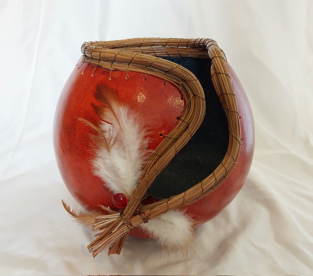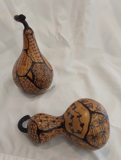 On another trip to Arizona, Barb was introduced to gourds at the Wuertz Gourd Festival, and brought home a bag of gourds to experiment with. She loves that you can do so many things with gourds. Lately she is working on her wood burning skills and having fun making thunder gourds.