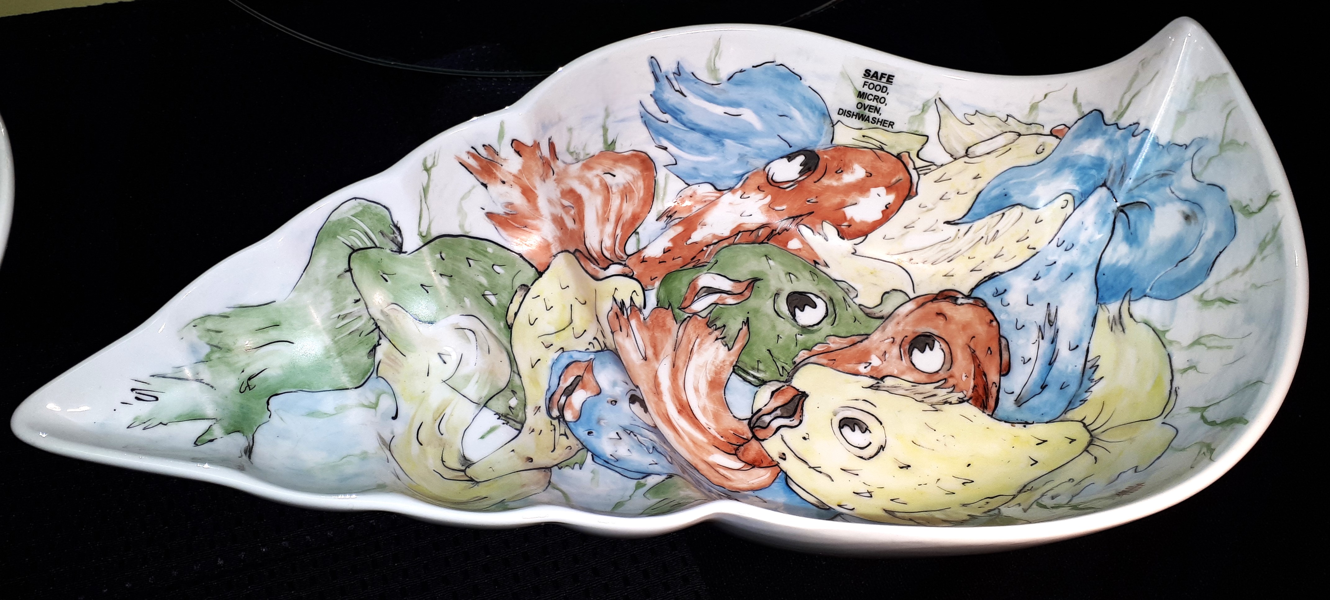 Flo-Elle Watson has attended a number of schools of art including the Kootenay School of the Arts, art courses at the University of Victoria, and the Victoria Art College. She has worked in the art field for more than 30 years creating, assisting, teaching and learning many mediums. After working in clay, oils, watercolours, and acrylics she settled on porcelain painting. Using clean white porcelain as her canvas, she creates original pieces of art. All of her art is hand draw with a black underglaze paint and then painted with a colored pigment. Each completed drawing and painting is fired in her kiln, making it permanent, non-toxic, oven, micro, and dishwasher safe as well functional piece of art.