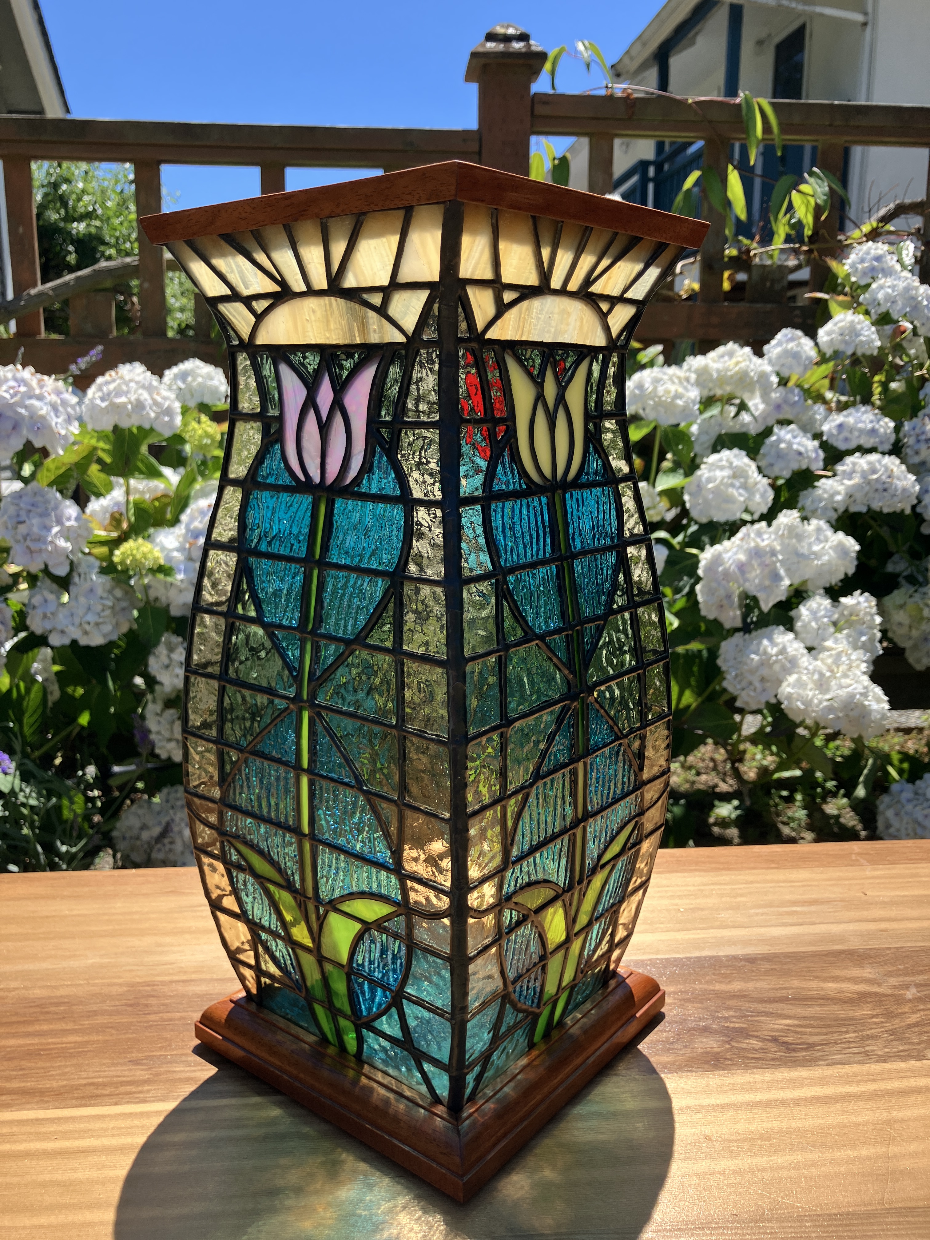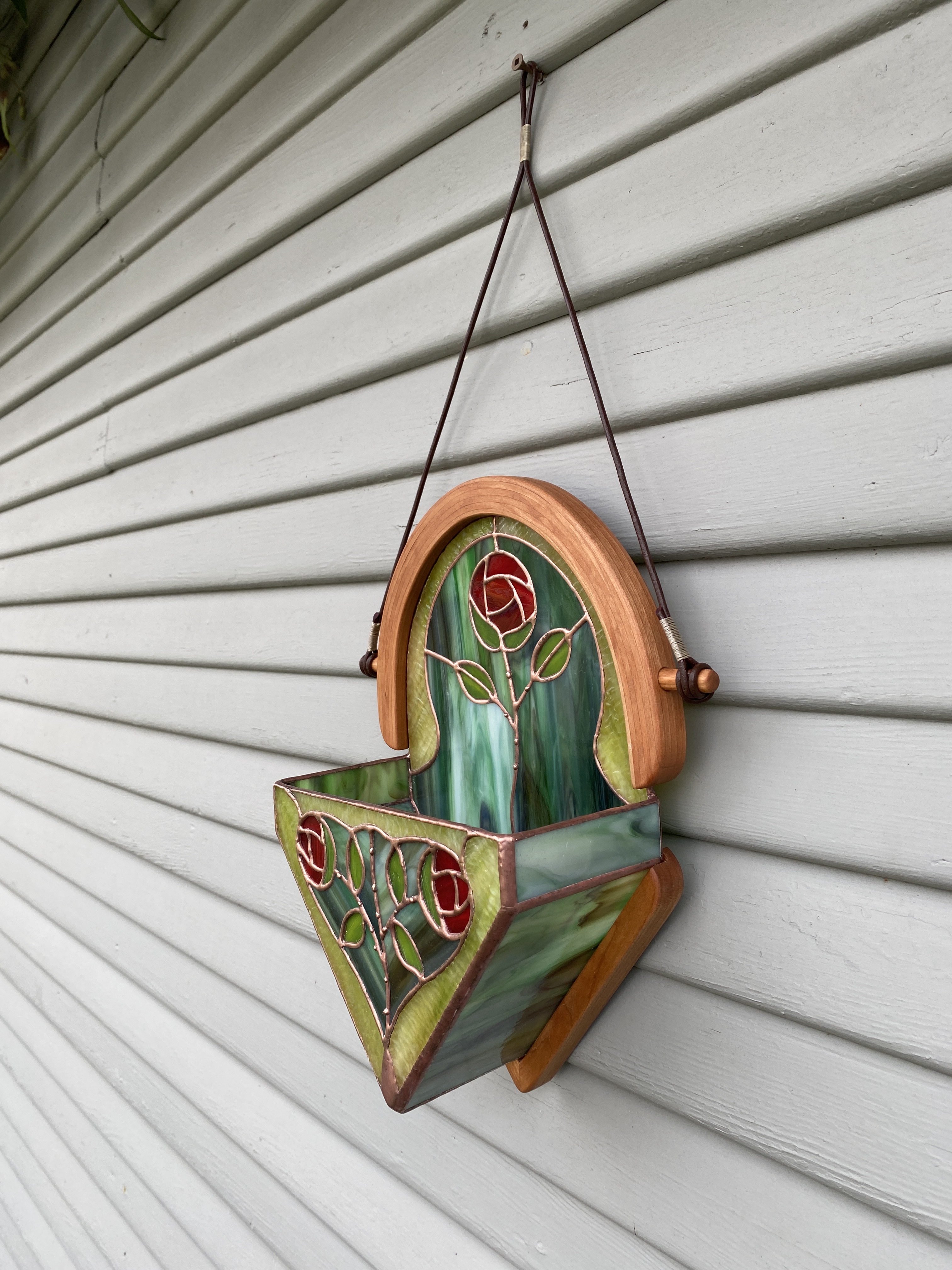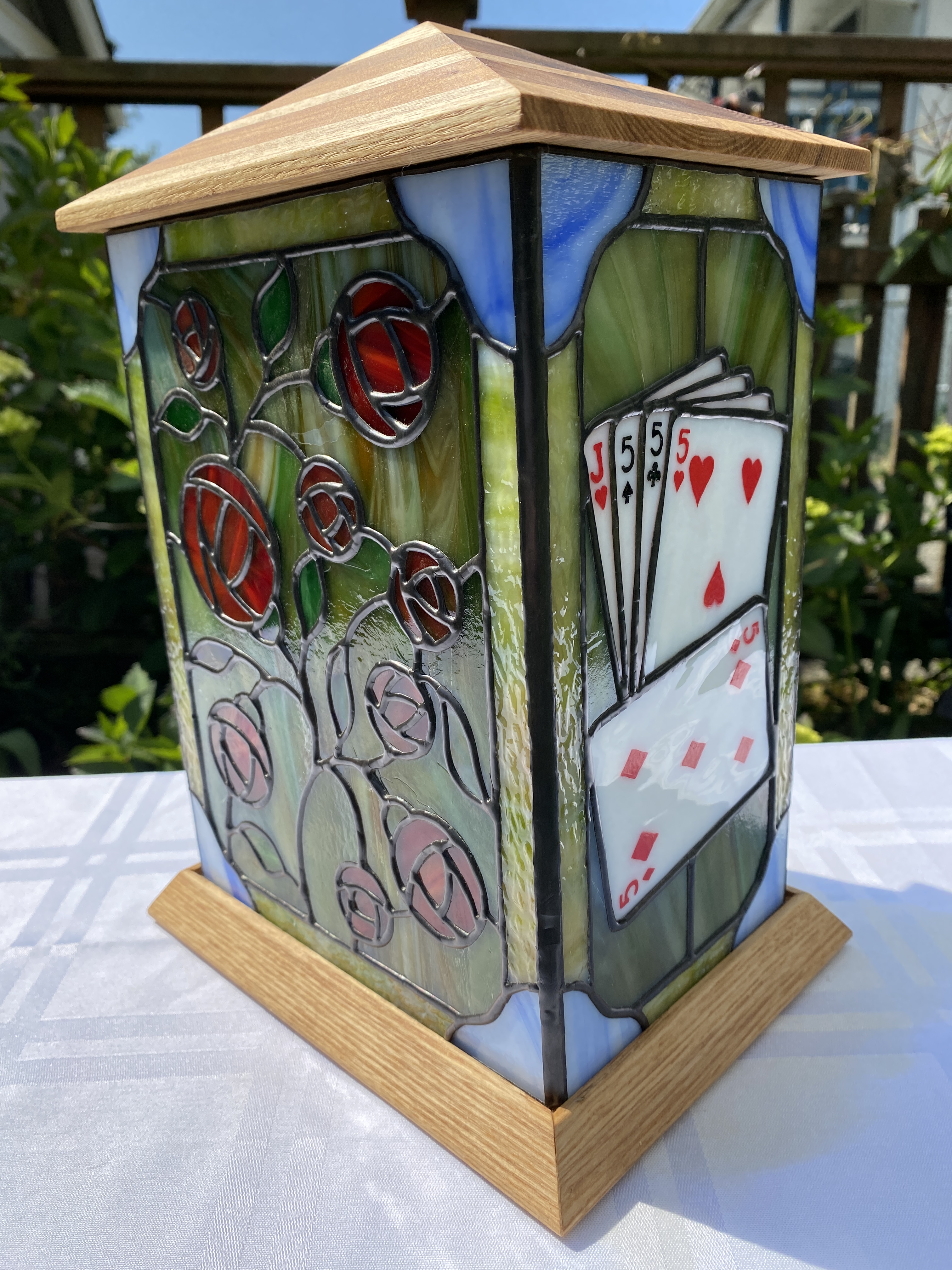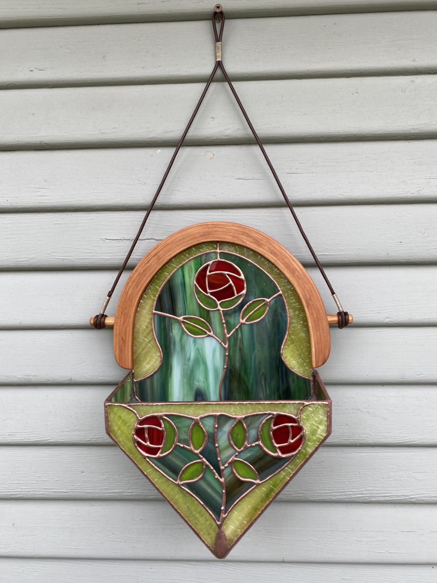 Gary, a resident of Victoria, BC, creates intricate works in wood, stained glass, and reclaimed materials. His love of woodworking began in his father’s workshop and grew through hands-on learning, formal training, and two years of study in Native art traditions – which deepened his connection to woodcraft. Over time, he immersed himself in the art of stained glass—learning both foil and came techniques that allow for precision and expressive depth. This new medium opened up a world of color, transparency, and light, enabling him to weave intricate patterns and moods into his work.