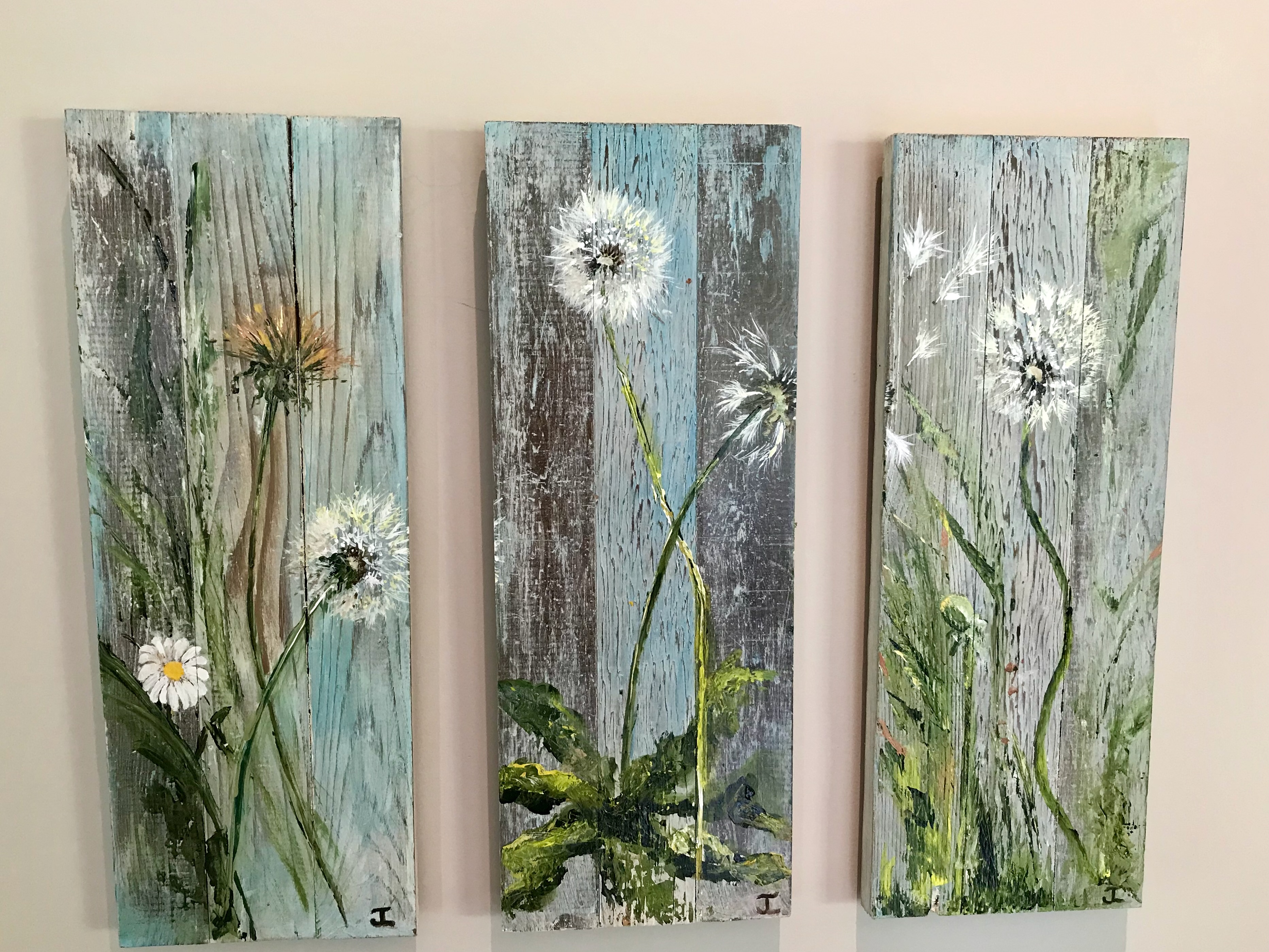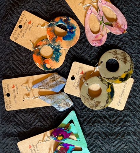 Although Jill’s passion is acrylic painting on large canvases and particularly on recycled wood boards, she has recently explored painting on smaller pieces of wood using acrylics, acrylic inks, and mixed media to produce unique wearable one of a kind earrings.