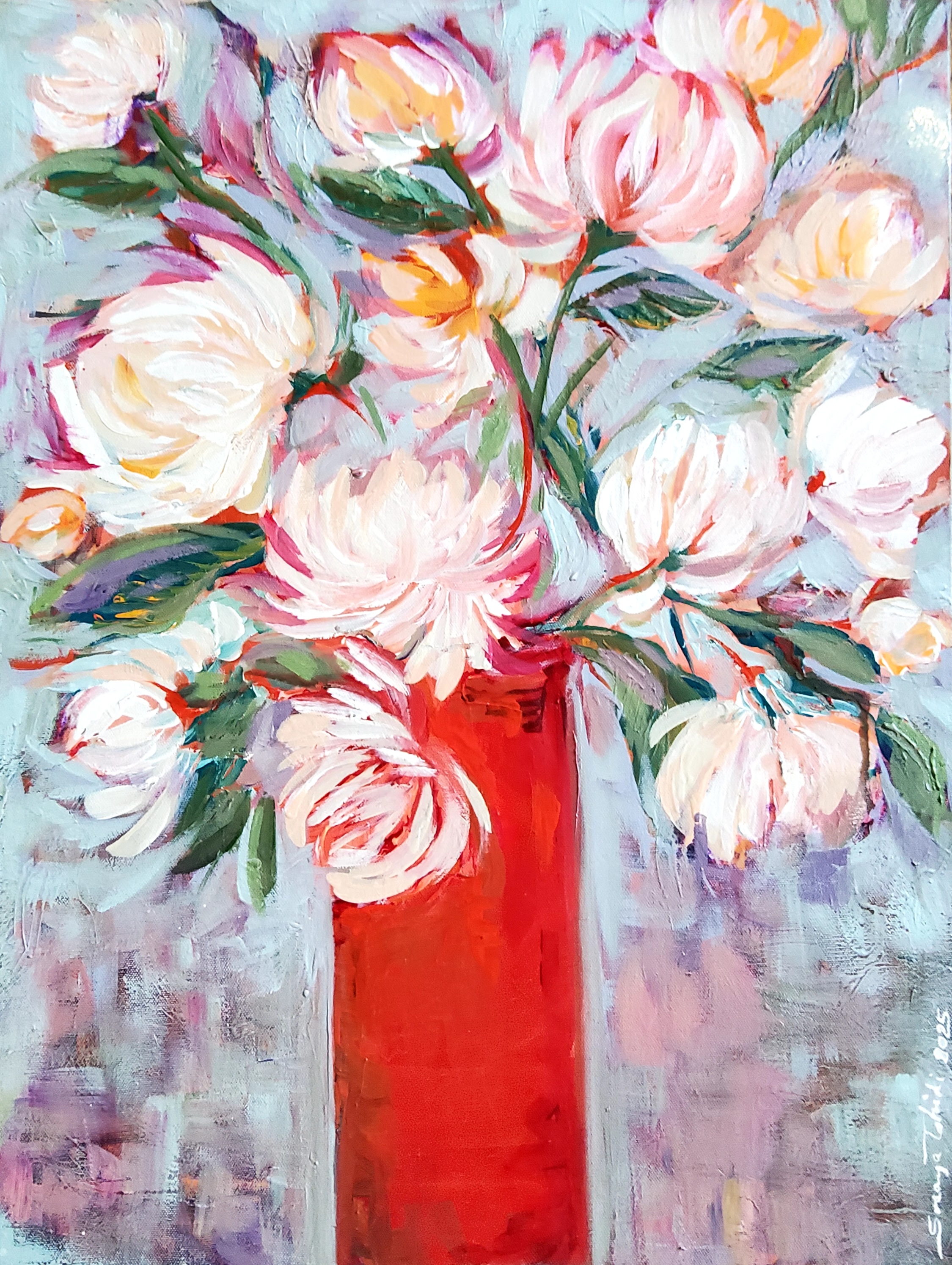 Living with fibromyalgia and mourning her former self introduced contrast—shadow and light, and a pursuit of inner joy. Art became a sanctuary where she could transcend physical pain and reconnect with beauty in the midst of chaos. Flowers became Soraya’s subject because they bring joy, embody gentle resilience, and offer healing through their beauty.